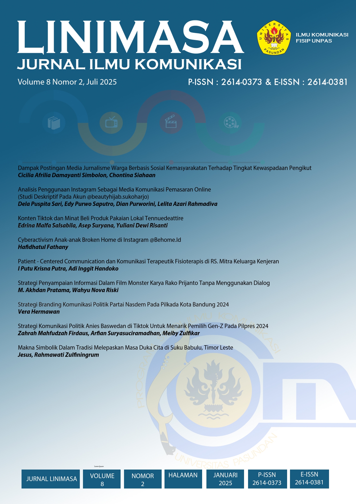 LINIMASA : Jurnal Ilmu Komunikasi P-ISSN 2614-0373 & E-ISSN 2614-0381, published by the Faculty of Social and Political Sciences of Pasundan University, is a peer-reviewed journal initiated by the Communication Studies Program of Pasundan FISIP University. Published twice a year, in January and July. The idea of LINIMASA journal comes to the phenomenon of the development of communication science that is so fast and dynamic following the changing times. Judging from its definition, LINIMASA draws a time line or an important event in a particular subject that is displayed in chronological order. LINIMASA journal accommodates a variety of thought / communication research results ranging from conventional media society to contemporary media society as it is today.