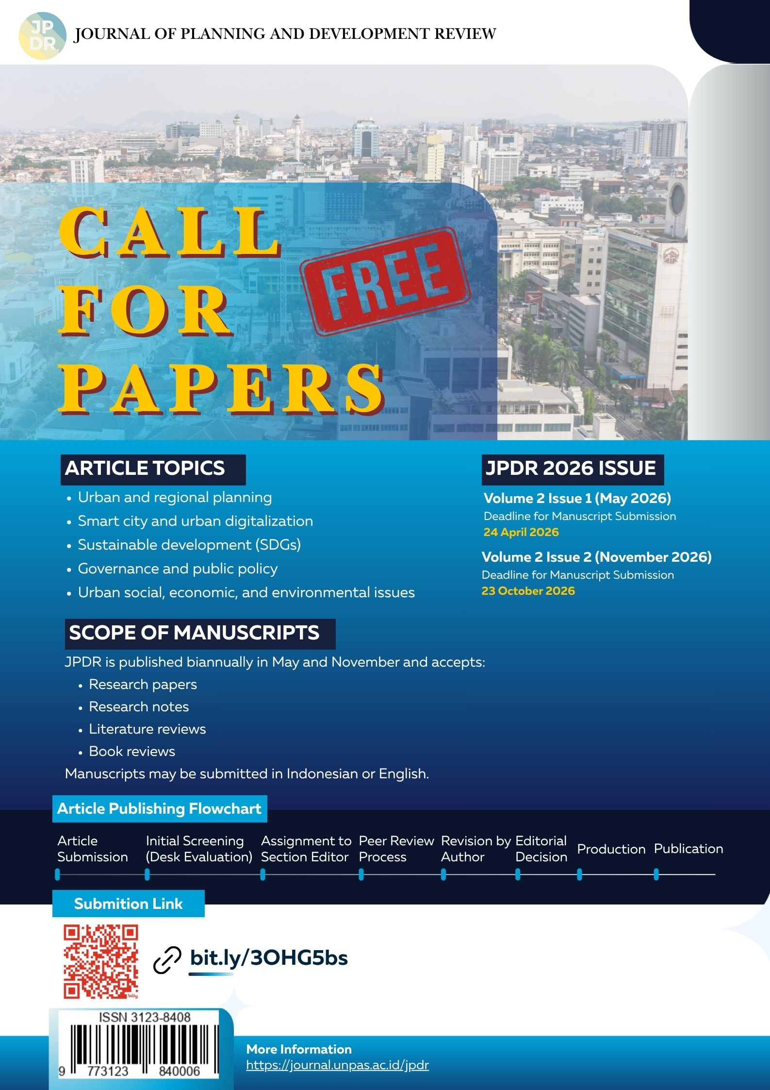 Bersama ini kami informasikan bahwa Journal of Planning and Development Review (JPDR) menerima submisi baru artikel di jurnal kami. Untuk publikasi pada Volume 2 No.1 (Bulan Mei) dan No.2 (Bulan November) Tahun 2026.